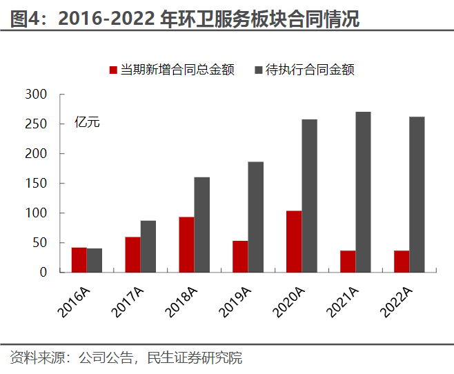 公司环卫服务、物业清洁板块待执行订单充沛,截至2022年底,环卫服务、物业清洁待执行合同金额分别为262.38亿元、7.50亿元,2023年上半年,公司新增合同金额38.25亿元,位居行业前三,进一步加强市场投入,为后续业绩增长提供持续动力。