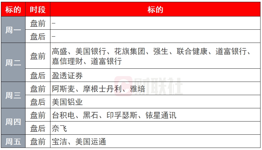 按照惯例,美股财报季将是以大金融→科技→各行各业(和中概股)的顺序披露。在本周摩根大通和富国银行开了一个好头之后,下周更多的金融巨头将披露财报。非金融板块中,芯片制造概念股阿斯麦和台积电可能会是中国股民比较关心的个股。