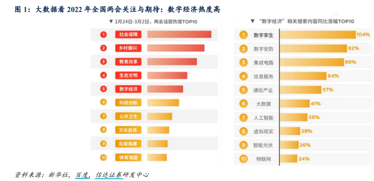 (1)2022年两会前夕,数字经济跻身热词 TOP5,相关内容搜索热度同比增长96%,成为网友最关注话题之一。其中,数字孪生、数字安防、集成电路、信息服务、通信产业等热词热度同比涨幅超50%。数字经济观念已经“深入人心”。
