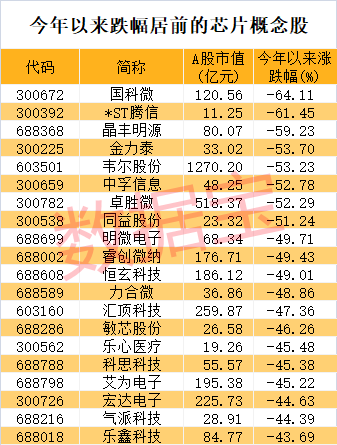 证券时报·数据宝统计,与去年底相比,芯片概念股A股市值合计减少超过万亿。今年以来,国科微、*ST腾信、晶丰明源、金力泰、韦尔股份、中孚信息、卓胜微、同益股份等跌幅超50%。国科微累计跌幅64.11%居首,自去年创下历史高点后,公司股价大幅走低。今年一季度公司净利润同比由盈转亏,国家集成电路产业投资基金股份有限公司(“简称大基金”)减持该股172万股。
