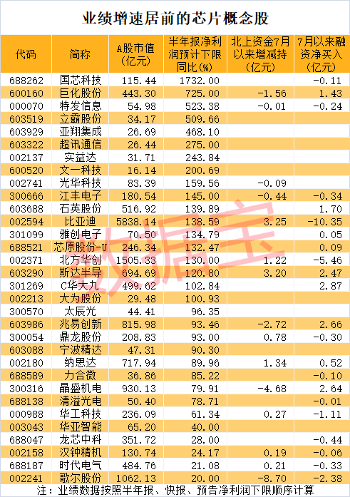 上述32只业绩大幅增长的芯片概念股中,7月以来按照成交均价计算,北上资金增持超亿元的仅比亚迪、斯达半导、纳思达、北方华创4股。同时获得融资客加仓超亿元的仅斯达半导,该公司是IGBT龙头,预计上半年净利润为3.4亿元至3.5亿元,同比增长120.8%至127.29%。