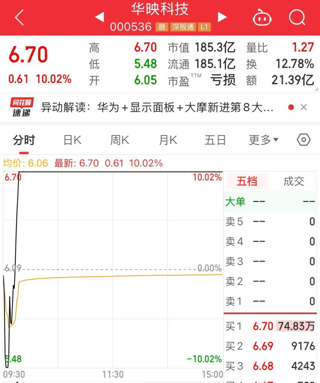 以华映科技为例,该股早盘一度被砸至跌停板,随后股价大幅拉升,不到15分钟股价涨停,收盘涨停板封单74.83万手,呈现“地天板”走势。截至目前,该股已连续收获7个涨停板,最新收盘价创七年来新高。