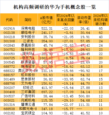 在上述21只机构调研10次以上的华为手机概念股中,截至11月4日收盘,最新收盘价与年内高点相比,8股回撤幅度超20%,分别是思泉新材、泰嘉股份、宝武镁业、兆威机电、江波龙、慧博云通、深南电路、安利股份。