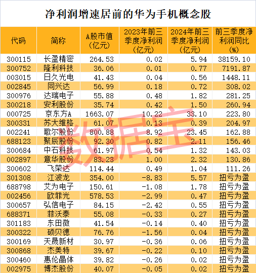受益于消费电子行业的复苏,华为手机概念股整体业绩呈现增长态势。今年前三季度,概念股合计实现盈利332.44亿元,同比增长84.93%。