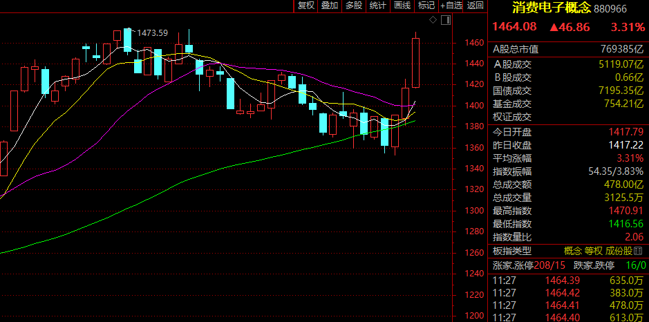 消费电子股早间全线走强,板块指数放量单边上扬涨逾3%,逼近年内最高点,半日成交接近昨日全天成交。