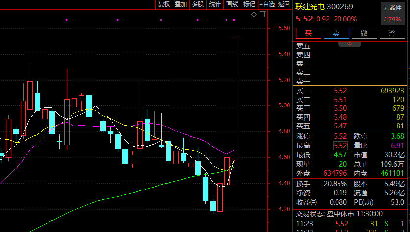 混合现实作为消费电子行业新兴赛道,受到市场重点关注。今日早间,混合现实放量飙涨逾6%,创历史新高,半日成交超昨日全天成交。联建光电、易天股份双双20%涨停,风语筑、五方光电等亦强势封板。