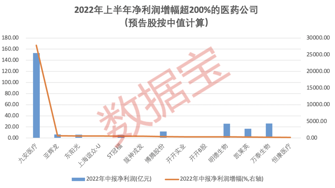 从增幅来看,五成以上医药公司业绩增长,28家公司净利润增幅超过100%。九安医疗净利润增幅仍位居首位;其次是亚辉龙,超过650%,公司涉及新冠检测、肝炎等概念;东阳光、ST冠福、陇神戎发等11家公司净利润增幅超过200%。