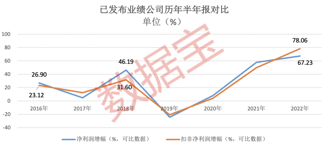 整体来看,这127家公司上半年录得净利润554.21亿元(预告按照预告中值计算,下同),实现扣非净利润379.91亿元,两者均创下2015年以来同期最高水平(以可比数据计算)。