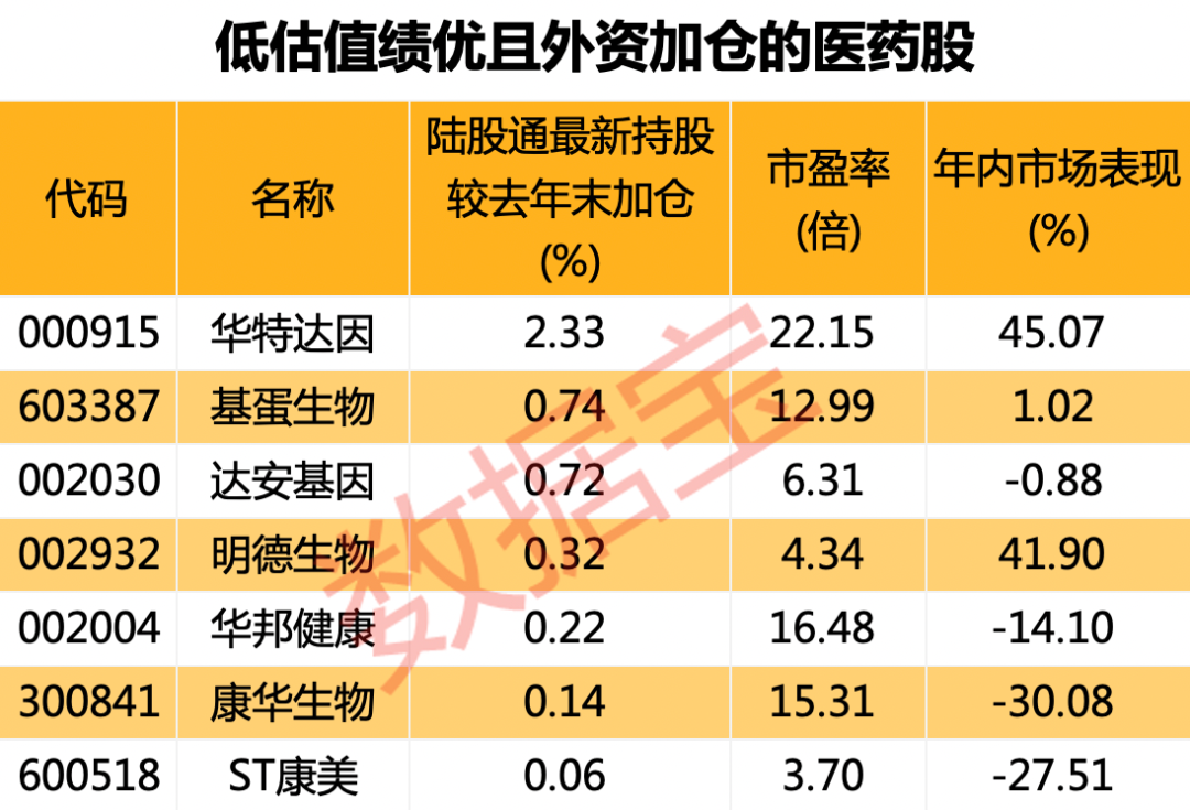 华特达因、基蛋生物获北上资金加仓幅度居前,前者加仓超过2个百分点。这7股年内平均上涨2.2%,华特达因、明德生物涨幅超过40%,康华生物、ST康美跌幅超过25%。