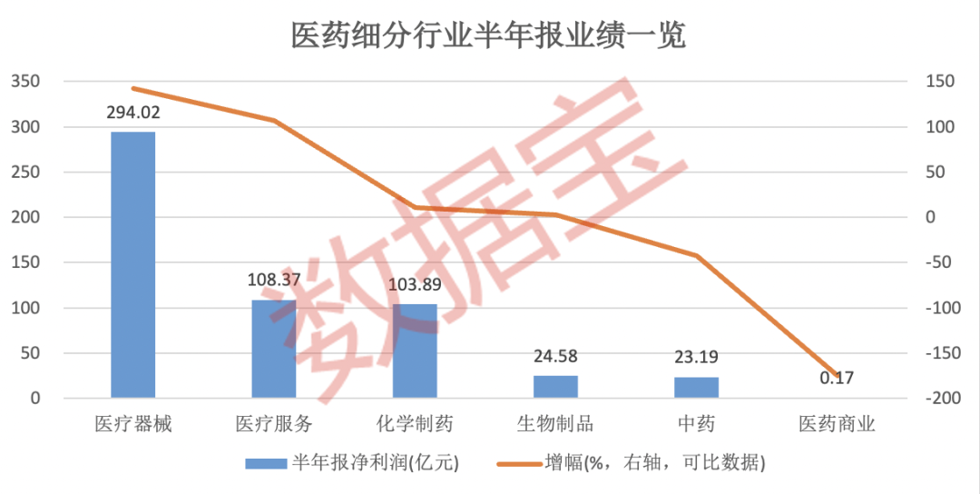 从细分板块看,医疗服务、医疗器械板块上半年净利润同比翻倍,其中医疗器械公司实现净利润接近300亿元,同比增长142.55%。