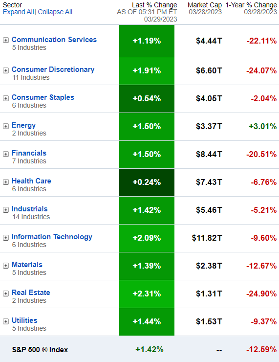 周三标普500指数的11个板块悉数走强,房地产(+2.31%)和信息技术(2.09%)板块领涨。