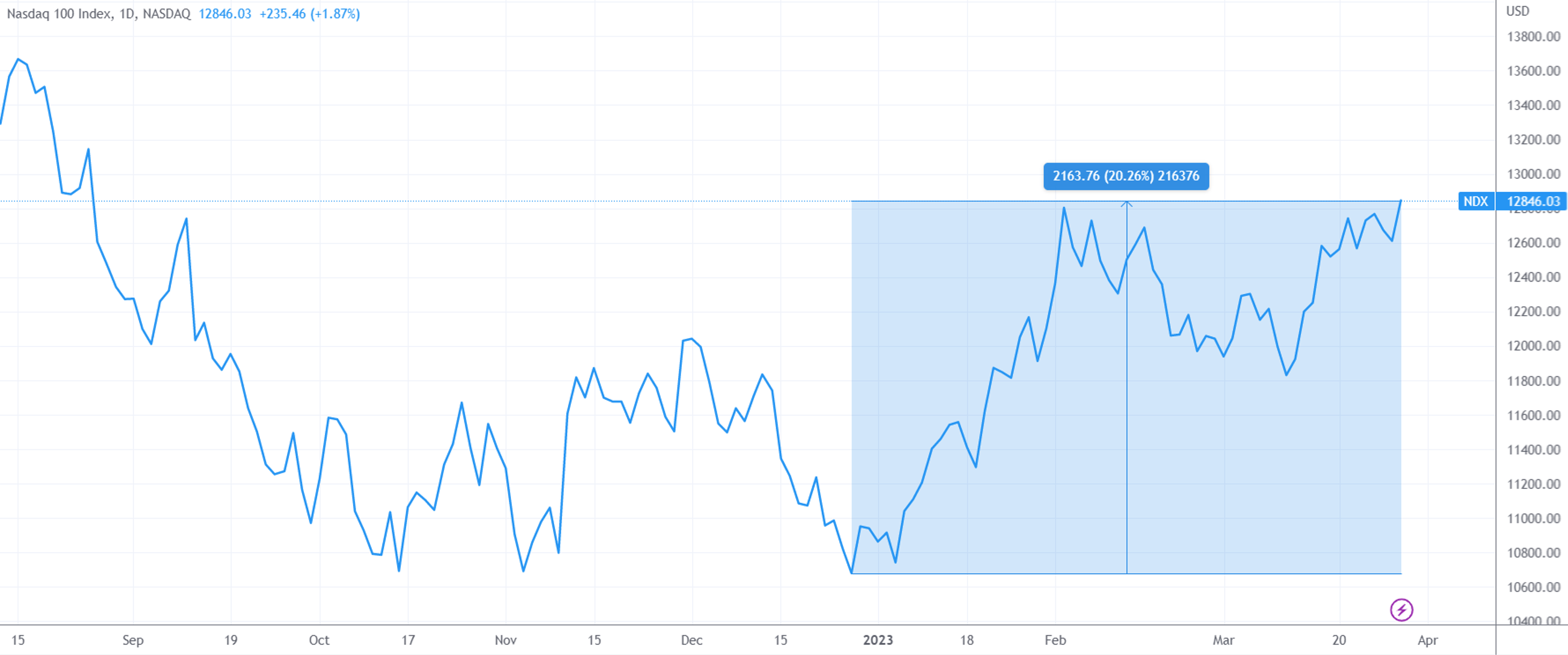 经历过去两天的波折后,周三美国科技股和银行股携手走强,三大指数收盘涨幅均达到1%。为今天锦上添花的是,代表着科技蓝筹的纳斯达克100指数周三收盘时,较去年12月28日的低点反弹超过20%,进入了崭新的技术性牛市。