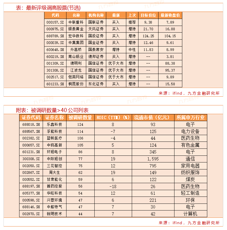 近5日有20家公司获得券商调高评级,中联重科、银泰黄金、宏华数科、中集集团、外高桥获证券给出明确目标价格。