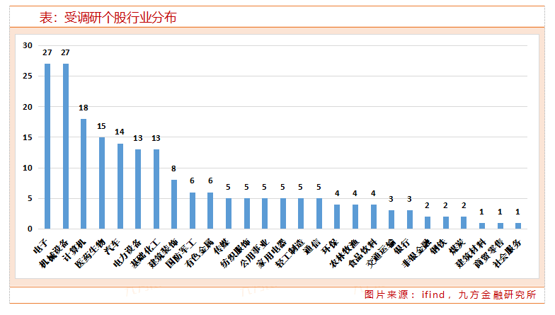 从行业分布来看,本期电子、机械设备行业调研量高居首位,有27家上市公司接受调研;随后为计算机行业,有18家上市公司接受调研。