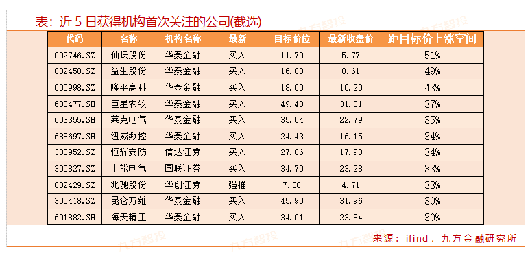 最新机构首次关注股票方面,近5日共有72份研报对上市公司进行首次覆盖,其中,34家获得明确的目标价格,华泰金控香港公司贡献大部分估值参考。