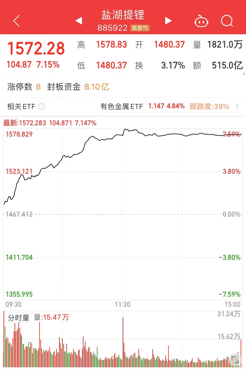 包括盐湖股份、西藏矿业、久吾高科在内的8只个股在开盘不久直奔涨停,还有天齐锂业、华友钴业、亿纬锂能在内的多只千亿市值白马股涨幅明显,最高者收涨超8%。