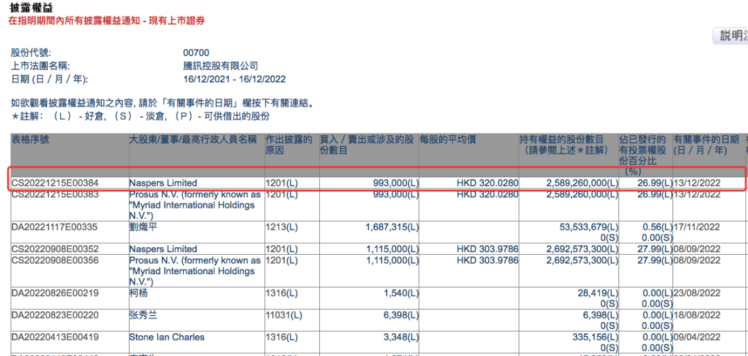 12月16日,港交所网站披露,腾讯控股最大持股方Naspers,在12月13日再度减持99.3万份腾讯股票,持股比例由从27.99%减少至26.99%,共套现3.18亿港元。