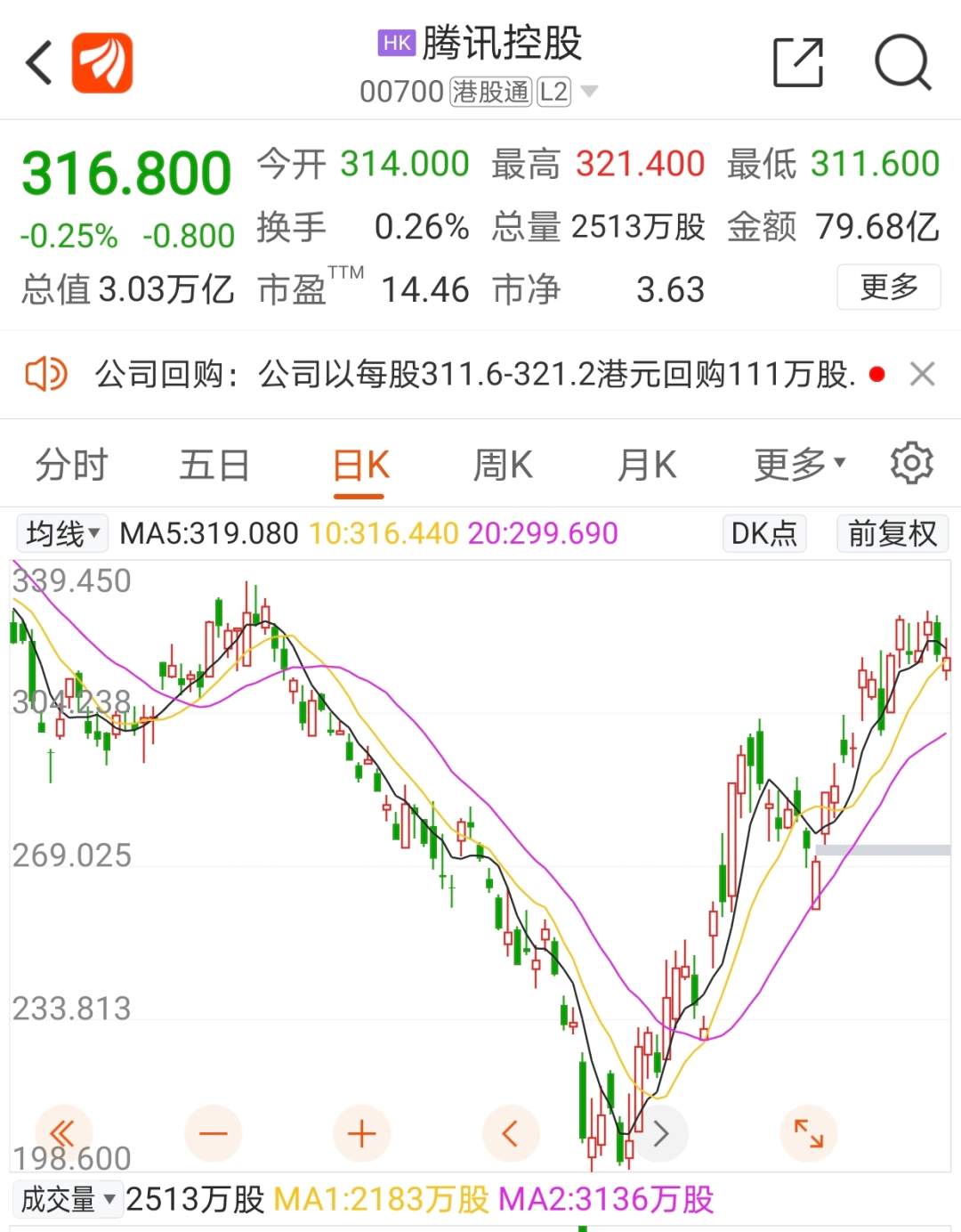 12月16日,腾讯控股公告,于当天又回购了111万股,回购价格为311.6-321.2港元,共耗资约3.5亿港元,这已经是腾讯12月以来的11次回购。