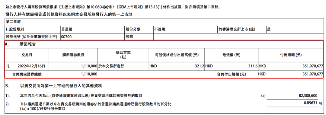 同时,腾讯今年继续进行着外界熟悉的回购动作,一度因为每个交易日盘后回购余约3亿港元被叫做“腾三亿”。