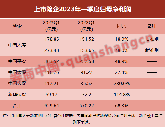 截至目前,五大上市险企都已披露一季度业绩。今年一季度开始,A股上市险企执行新保险合同准则和新金融工具准则,在新准则之下,合计归母净利润达到959.64亿元,同比大幅增长近七成。