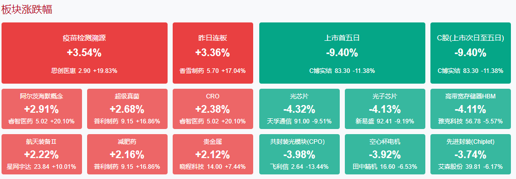 盘面上,医药股集体逆势走强,其中CRO、创新药方向领涨,睿智医药、舒泰神、华森制药、百花医药、鲁抗医药涨停。猪肉股震荡反弹,金字火腿涨停。黄金概念股午后拉升,莱绅通灵涨停。商业航天、低空经济概念股局部活跃,腾达科技10连板,深城交、航天晨光、星网宇达涨停。下跌方面,AI硬件方向集体调整,CPO概念股领跌,天孚通信跌近10%。板块方面,CRO、贵金属、创新药、猪肉体等板块涨幅居前,CPO、半导体、铜缆高速连接、PCB等板块跌幅居前。