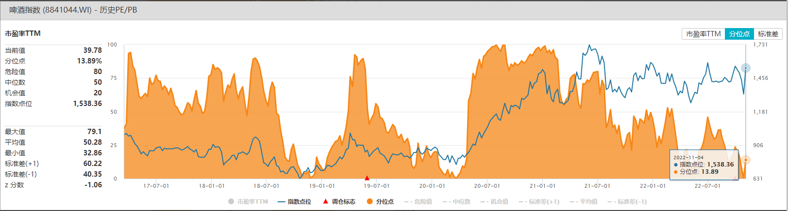 啤酒:市盈率(TTM)为39.78,分位点13.89%。