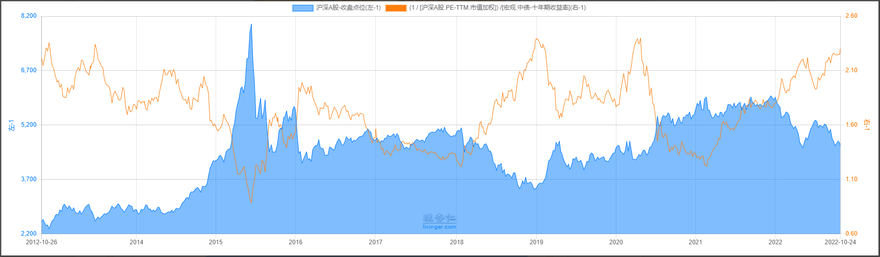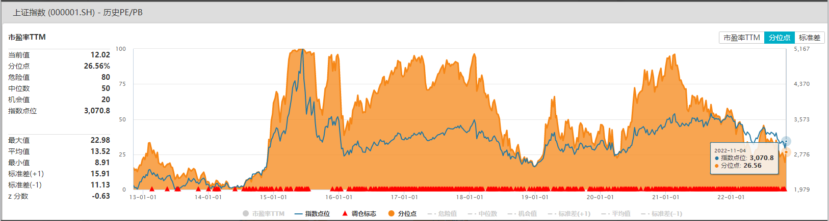 我们统计了从2013/11/4至2022/11/4上证指数和深成指数的市盈率TTM的分位点。上证指数目前的市盈率分位点在26.56%(分位点代表上证指数10年内的估值分布,数值越低说明价格越低,价值越被低估),估值水平偏低。我们看深成指数目前的市盈率分位点在49.22,估值适中。从股债收益比来看目前A股市收益率是国债的2.3倍,处在极具性价比的位置,历史上超过2倍的位置都A股的估值低谷,目前已经处在超跌区间。
