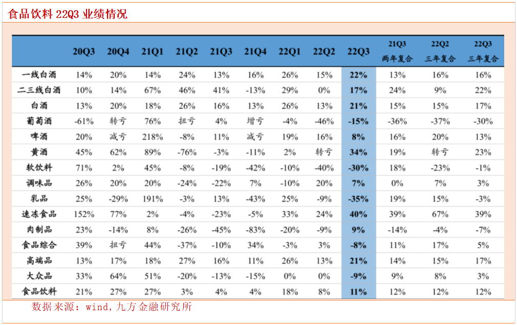 乳制品:需求较疲软,龙头业绩承压。22Q3乳制品板块收入/归母净利润同比+4.7%/-27.8%,收入增速放缓,利润同比环比均下滑。整体需求仍疲软,子版块现分化,常温白奶稳健增长,低温白奶延续双位数增长,酸奶压力仍较大,低温奶酪棒增速放缓,常温及餐饮奶酪保持高增。利润端来看,原奶价格延续小幅回落趋势,但部分高毛利产品增速有所放缓,以及龙头企业伊利短期费用投放增长影响利润率。相比全国化企业,区域乳企天润乳业、新乳业表现亮眼,实现逆市增长,主要得益于公司积极开拓市场、完善渠道,大单品放量以及加速推新。
