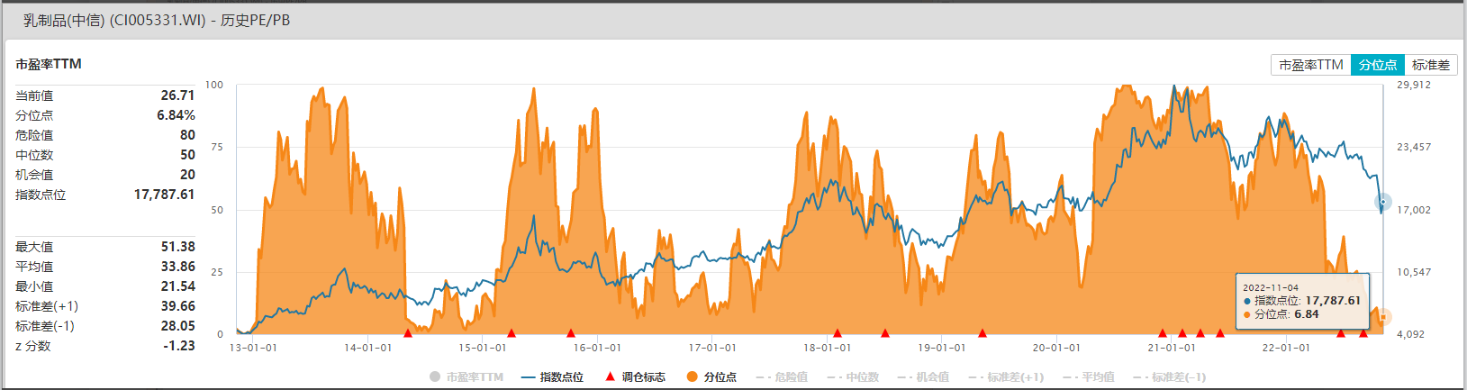 乳制品:市盈率(TTM)为26.71,分位点6.84%。