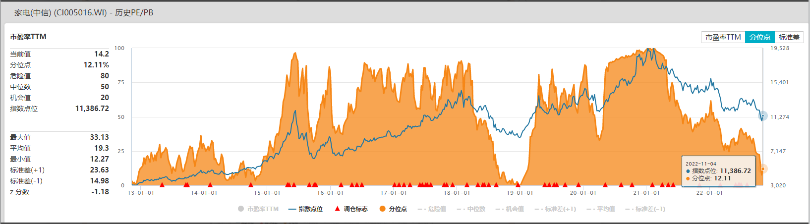 家电:市盈率(TTM)为14.2,分位点12.11%。
