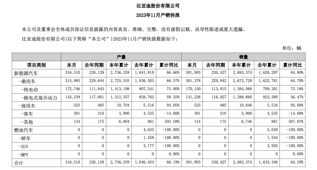 截至11月底,比亚迪今年累计产量已达273.62万辆,同比增长66.66%;累计销量268.34万辆,同比增长64.8%,距离300万辆大关已不遥远。