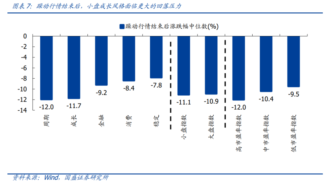 国盛证券分析师张峻晓2月12日发布的研报指出,2023年的春季行情“成色”似有不足,此前趋于一致的躁动预期也有所松动。时点上看,A股的春季躁动大多数终结于两会前后。结构上看,春季躁动行情更倾向于进攻性板块,成长性、高弹性主线占优,而在躁动行情结束后,前期涨幅较大的板块回调幅度也更大,对应的是小盘成长风格面临相对更大的股价回落压力。
