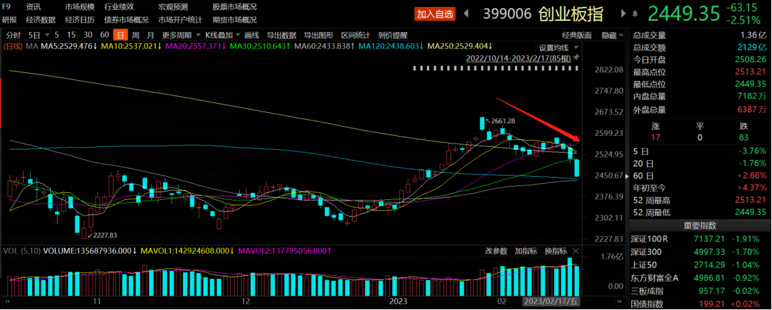 创业板指周五收跌超2.5%,周线录得三连阴,自1月30日高点迄今累计跌幅近8%。