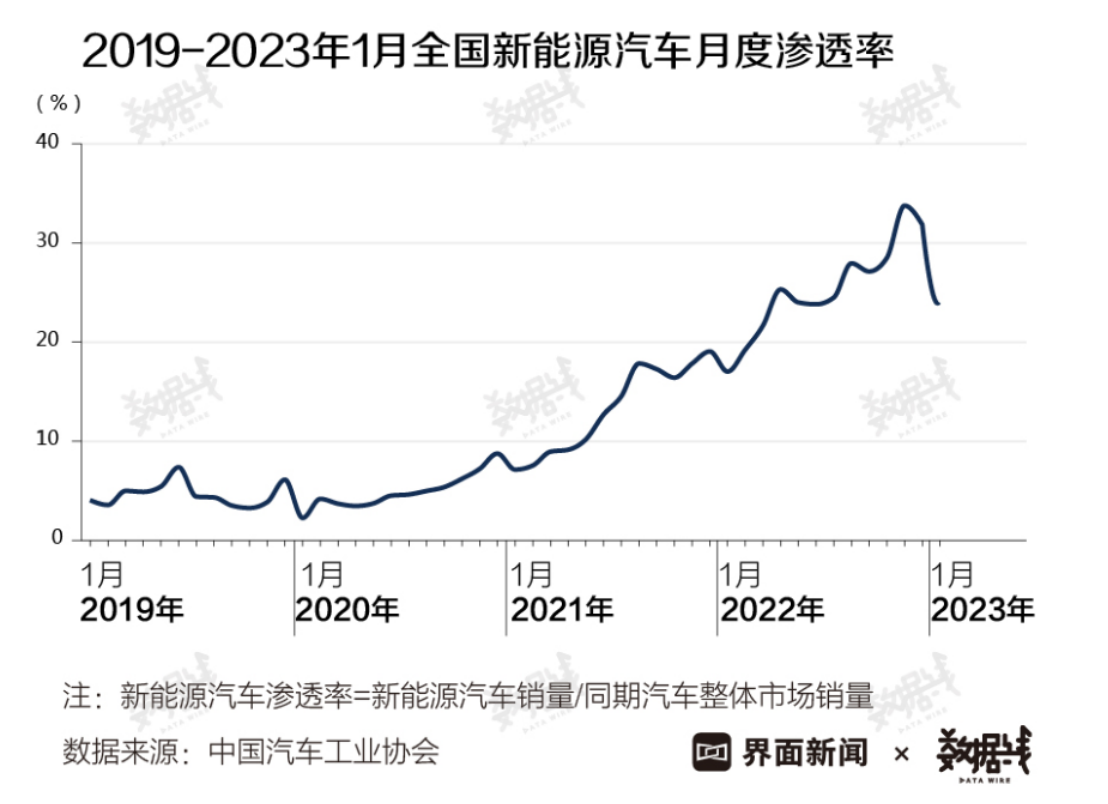 其中,2021年4月至2021年11月,新能源车渗透率由10.98%提升至20.84%,新能源领涨。据中国汽车工业协会数据,近几年上半年的新能源渗透率提升明显,2023年1月新能源车国内零售渗透率25.7%,处于低位,2022年单月渗透率最高达31.85%。国海证券研报显示,渗透率处于30%-50%区间时,行业超额收益开始进入震荡区间,上有顶、下有底,渗透率的斜率和天花板成为最重要的因素,如果斜率加速或者天花板足够高,相关行业还会有投资机会,但高度受20%渗透率附近的高点限制。