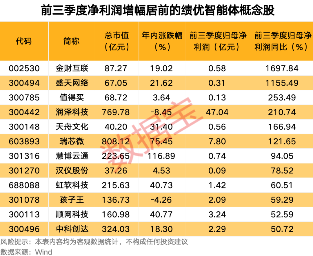 从业绩表现来看,目前70余只智能体概念股发布前三季度业绩报告,润泽科技的净利润规模最大,公司前三季度营收为39.77亿元,同比增长15.05%;净利润为47.04亿元,同比增长210.74%。