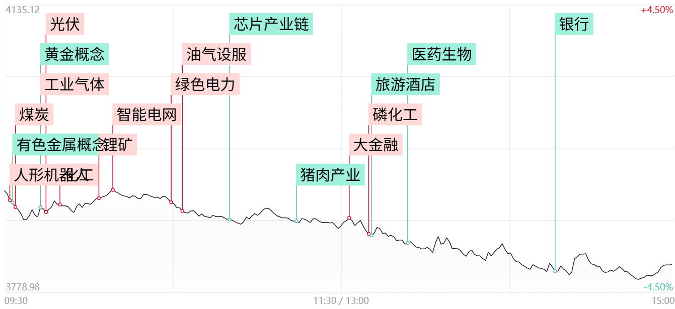 市场全天震荡调整,三大指数低开低走盘中均跌超4%,沪指尾盘勉强守住3800点关口。沪深两市成交额2.43万亿,较上一个交易日放量1447亿。盘面上,情绪降至冰点,全市场超5100只个股下跌,其中133只个股跌停。从板块来看,绿电概念逆势走强,华电辽能6连板,东方新能6天4板,立新能源3天2板。太空光伏概念震荡拉升,华民股份20CM涨停,中利集团2连板。煤炭板块表现活跃,云煤能源、辽宁能源涨停。下跌方面,贵金属概念跌幅居前,赤峰黄金、四川黄金跌停。旅游板块持续调整,三峡旅游、桂林旅游、岭南控股跌停。截至收盘,沪指跌3.63%,深成指跌3.76%,创业板指跌3.49%。