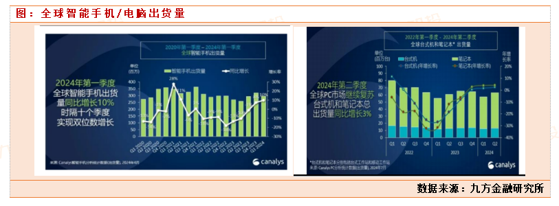 今年以来消费电子景气度回升,AI的大趋势下,AI手机和AI电脑相继推出,带动新一轮换机潮的来临。2024年Q1全球智能手机出货量约为2.89亿部,同比增长7.74%,中国市场智能手机出货量2024年Q1约为6930万部,同比增长6.5%。PC端,2024年Q1全球PC出货量约为5980万台,同比增长5.10%。我们从消费电子的销量数据可以看出,消费电子的景气度在经历22,23年的景气低估后,目前景气度在逐步的回升。景气度回升,有望带动消费电子领先功率半导体库存的去化加速。