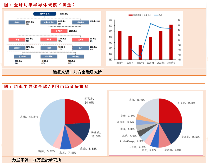 全球功率半导体市场规模在2018年约为481亿美元,2023年预计将达到503亿美元,2018-2023年复合增速约为0.90%;中国功率半导体市场规模在2018年达到1312亿元,2023年预计达到1519亿元,2018-2023年复合增速约为2.99%。根据Omdia统计,按照产品类型分,功率IC和功率分立器件市场规模分别为391/289亿美元,MOSFET、IGBT作为功率分立器件价值量最大的部分,2022年全球市场规模分别达到127/76亿美元。按照应用分,2021年汽车/工业(包括光伏、风电、工控、轨交)/消费占比为31/36/17%。中国是全球最大的功率半导体市场。