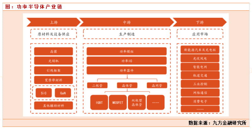 功率半导体是电子装置中电能转换与电路控制的核心,主要用于改变电子装置中的电压和频率,以及直流电与交流电的转换等,在发电、输电到用电的整个流程中不可或缺。功率半导体产业链上游主要是原材料及设备供应环节,包括晶圆、光刻机、引线框架、宽禁带材料的供应;中游主要是芯片制造、设计、封装等生产制造环节,产品包括功率IC、分立器件和模块,其中IGBT和MOSFET在功率分立器件中价值量最大;下游的应用市场涵盖不同领域,主要包括汽车,新能源,工控,消费电子等领域。