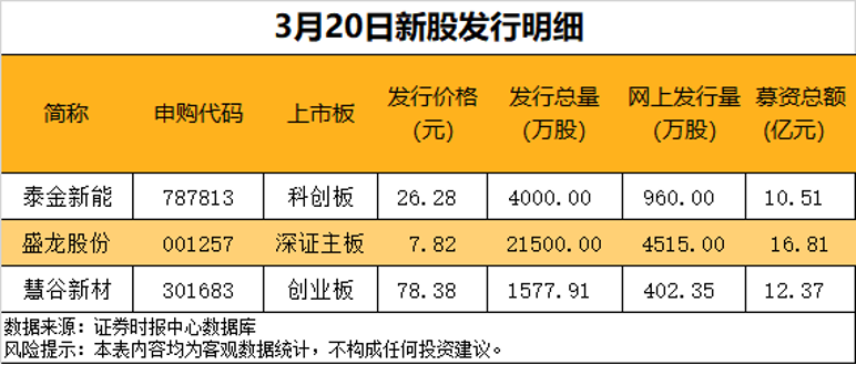 今日(3月20日)共有3只新股集中发行,分别是科创板的泰金新能、深市主板的盛龙股份、创业板的慧谷新材。