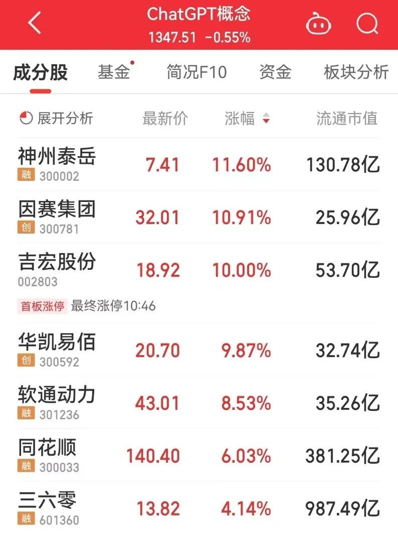 ChatGPT概念股也在近日持续走高。Wind数据显示,3月20日,ChatGPT概念指数微跌0.55%,但神州泰岳、吉宏股份、因赛集团、华凯易佰等概念股涨幅超过9%,同时,软通动力、同花顺、三六零等概念股也涨超4%。ChatGPT概念指数较年初已经上涨31.12%。