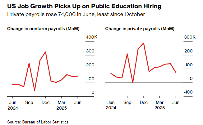 在6月就业报告发布后,美国经济日程明显放缓——该报告似乎缓解了美联储在本月晚些时候会议上降息的压力。就业增长超出预期,主要因公共教育领域就业人数异常激增,同时失业率有所下降。