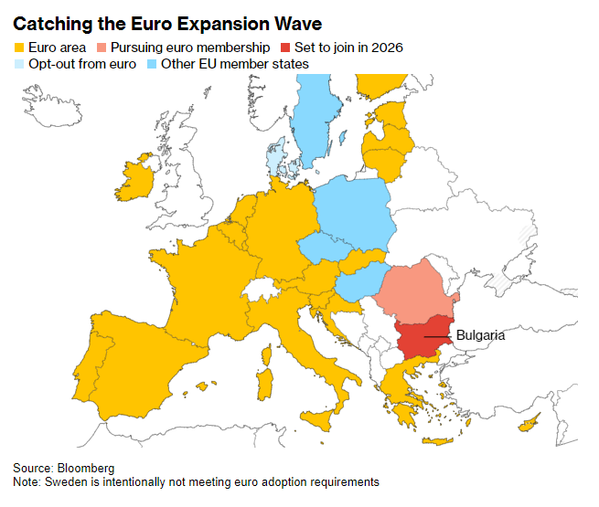 欧元区财长将于本周初开会,议程包括保加利亚转换欧元的汇率问题。官员们还将签署立法法案,最终确定该国从明年 1 月起加入单一货币区的新成员资格。