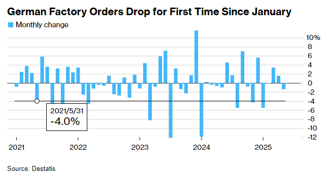 继周五公布德国5月工厂订单降幅远超预期后,欧元区各地制造业相关数据将备受关注,这些数据将显示特朗普关税政策的影响。