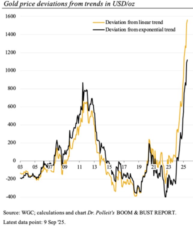 对照长期趋势线分析,当前黄金价格似乎处于“昂贵”区间。白银虽同样偏离长期趋势,但偏离程度相对缓和。例如,以21世纪伊始的线性趋势为基准,当前金价较趋势线高出42%(合1550美元/盎司);即便采用指数趋势线衡量,仍高于趋势值30%(合1100美元/盎司)。