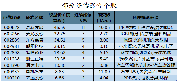 截至收盘,沪深两市合计855个股上涨,4079只个股下跌,平盘个股138只,停牌的个股1只。不含当日上市新股,共有38只个股涨停,5只个股跌停。续涨停天数看,高新发展已连收11个涨停板,连续涨停板数量最多。