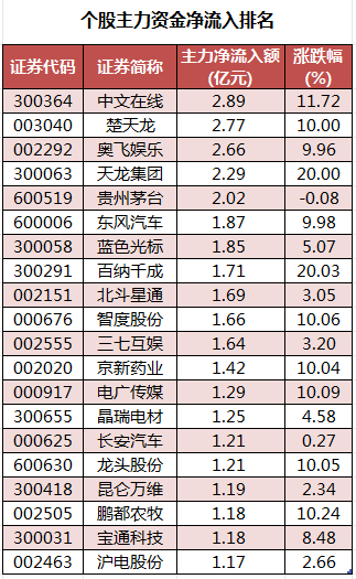 个股来看,今日有1585个股获主力资金净流入,其中,29股获主力资金净流入超1亿元。中文在线获主力资金净流入最多,净流入金额为2.89亿元;主力资金净流入居前的个股还有楚天龙、奥飞娱乐、天龙集团、贵州茅台、东风汽车,流入金额分别为2.77亿元、2.66亿元、2.29亿元、2.02亿元、1.87亿元。