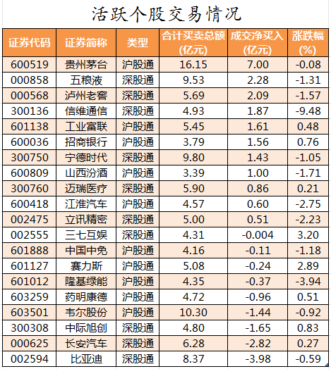 活跃个股方面,北向资金今日净买入较多的有贵州茅台、五粮液、泸州老窖、信维通信、工业富联,净买入金额分别为7亿元、2.28亿元、2.09亿元、1.87亿元、1.61亿元。北向资金净卖出较多的有比亚迪、长安汽车、中际旭创、韦尔股份、药明康德,净卖出金额分别为3.98亿元、2.82亿元、1.65亿元、1.44亿元、0.96亿元。