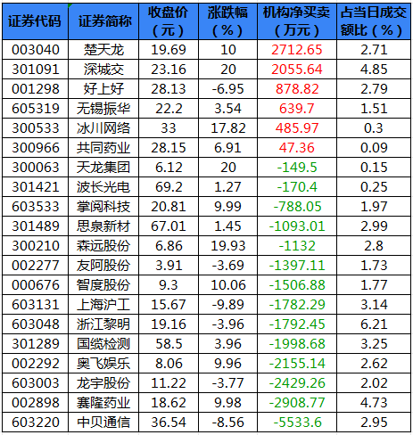 楚天龙今天涨停。盘后数据显示,1个机构出现在龙虎榜单上,净买入2712.65万元;华鑫证券有限责任公司上海分公司买入2593.27万元,同时卖出292.2万元;华泰证券股份有限公司深圳益田路证券营业部买入22.44万元,同时卖出4003.2万元。