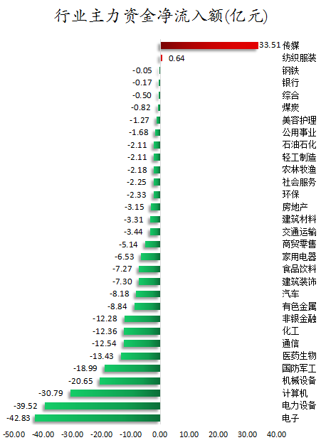从行业板块来看,申万所属的31个一级行业,今日仅有传媒、纺织服装2个行业板块主力资金呈现净流入,净流入金额分别为33.51亿元、0.64亿元。29个行业板块主力资金呈现净流出,其中,电子行业板块主力资金净流出最多,净流出金额为42.83亿元;行业板块主力资金净流出靠前的还有电力设备、计算机、机械设备、国防军工、医药生物、通信,净流出金额分别为39.52亿元、30.79亿元、20.65亿元、18.99亿元、13.43亿元、12.54亿元。